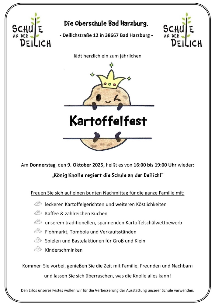 am 09.10.2025 findet unser Kartoffelfest statt. Wir laden Sie und euch wie jedes Jahr herzlich ein, gemeinsam einen kurzweiligen Nachmittag an unserer Schule zu verbringen. Freut euch auf Kartoffelpuffer, Ofenkartoffeln, Pommes, Kaffee und Kuchen und noch vieles mehr!